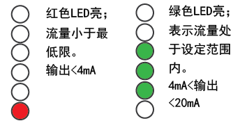 將流量開關裝好,使介質以需要監測的低限流速流動,調整下限旋鈕,使第一個綠色LED亮(4mA)。使介質以需要檢測的上限流速流動,調整上限旋鈕,使第五個綠燈亮(20mA);此后,輸出將正比于上限和下限之間的流速,即4mA對應下限流速,20mA對應上限流速。