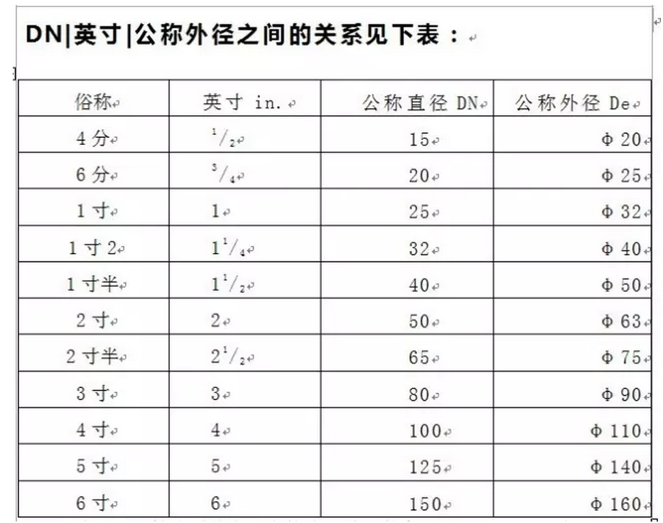 注意:這既不是外徑也不是內徑;應該與管道工程發展初期與英制單位有關;通常用來描述鍍鋅鋼管,它與英制單位的對應關系如下: