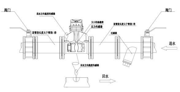 1、安裝必須在專業人員指導下進行 2、安裝前確保熱量表外觀無損壞,溫度傳感器電纜無破損 3、確定安裝管路與熱量表標稱直徑一致 4、確定熱量表安裝兩端的管線在同一軸線上(偏差不大于5mm) 5、確保熱量表上標志的水流方向與實際一致。