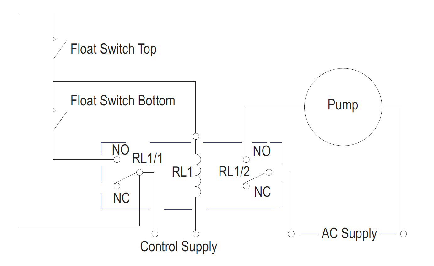只要液體高于該開關點,底部開關將關閉。液體上升直到頂部浮動開關關閉并為繼電器供電。一組繼電器觸點將泵連接到電源,另一組繼電器保持繼電器接通狀態,而電平則朝向底部開關。