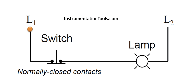 例如,下圖顯示了一個常開按鈕開關控制 120 伏交流電路上的燈(交流電源的熱極和中性極分別標記為 L1 和 L2):
