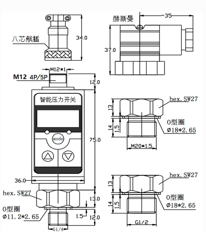 △ 全程: 詳見選型表△ 過載能力: 詳見下表 △ 開關輸出: 設定范圍 05%......100%量程 準確度 0.5%量程 開關數量 1或2個可選 輸出功能 PNP; NPN常開+常閉 接點鍍金 額定電流 ≤300mA 響應時間 ≤30ms △ 模擬輸出 : 輸出類型 ≤4...20mA 模擬量輸出 負數 ≤500; 準確度 0.5%量程 △ 重復性: 0.5%量程 △ 顯示: 紅色9mm LED, 范圍 -999....9999 △ 電源: 15....30V DC △ 電氣保護: 反極 ,過載,短路保護 △ 環保溫度: -20.....80 △ 介質溫度 -30....100 △ 儲長溫度 -40....1000 △ 溫度影響 <±0.03%FS/K △ 防護等級 IP67 △ 過程連接 不銹鋼+NBR密封 △ 外殼材料 鋅合金 △ 電氣連接 M124芯接插件 M125芯接插件(用于 1模擬量+2開關量型)